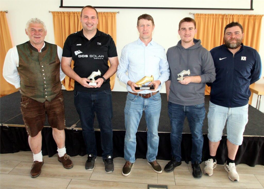 Von links: Georg Aimer, Tobias Kirmeier 300 Spiele, Johannes Auer 600 Spiele, Manuel Brosig 100 Spiele und Robert Kruse – Trainer.