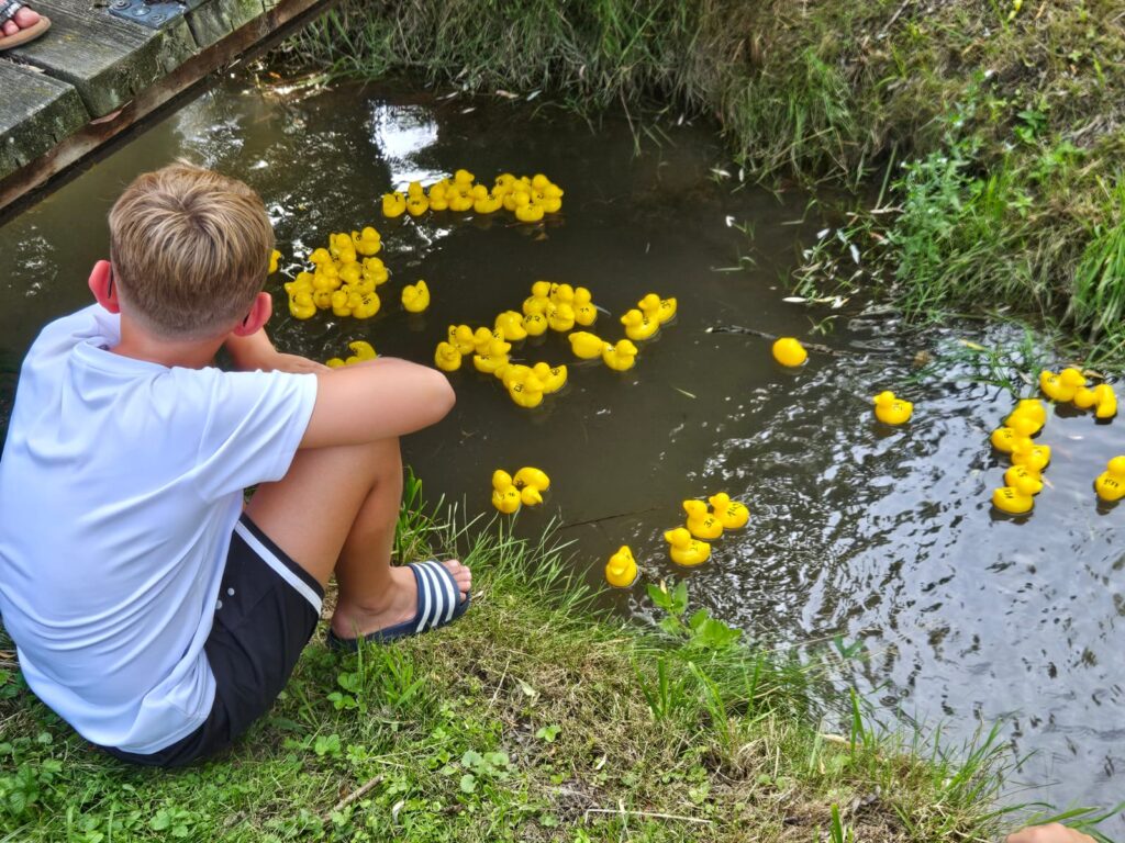 Die erfolgreichen Schafkopfer von links nach rechts: Georg Auer, Sieger Wast Müller mit 68 Gewinnpunkten, gefolgt von Christian Neulinger (63 Punkte) auf Platz zwei und nicht auf dem Foto Raimund Kmetetz (58 Punkte) auf dem dritten Rang, ganz rechts Turnierorganisator Ludwig Mangstl komplettiert die Runde der Finalisten und sorgte für den reibungslosen Ablauf des Turniers. Kulinarisch hatte das Fest wieder einiges zu bieten: Die Feuerwehr servierte Steckerlfisch, Grillkäse, Pommes sowie eine knusprig gegrillte Sau. Der Gartenbauverein ergänzte das Angebot mit einer großen Auswahl an frischen Salaten, während der Sportverein für kühle Getränke sorgte. Am Nachmittag stand Spiel und Spaß für die ganze Familie auf dem Programm. Das beliebte Entenrennen des Kinderfördervereins lockte wieder viele kleine und große Zuschauer an den Dorfweiher. Die Landjugend kümmerte sich um die Betreuung der Hüpfburg und veranstaltete ein Fußball-Darts-Turnier. Auch die Hufeisenwerfer trugen ihre Einzelmeisterschaft aus – mit viel Ehrgeiz und guter Laune. Musikalisch begleitet wurde der Tag von der Gruppe „Zammagfunden“, die mit ihrem Repertoire für abwechslungsreiche Unterhaltung sorgte. Zum Abend hin wurde nochmals der Grill angeheizt. Der Helferkreis servierte zusammen mit der Initiative „Zusammen für die Ukraine“ orientalische und ukrainische Spezialitäten. Für den stimmungsvollen Ausklang sorgten die Cocktailbar des Kinderfördervereins sowie die Weinlaube, betrieben vom Männergesangverein und dem Kirchenchor. Bei lauen Temperaturen und erfrischenden Getränken genossen die Gäste den sommerlichen Abend in vollen Zügen.