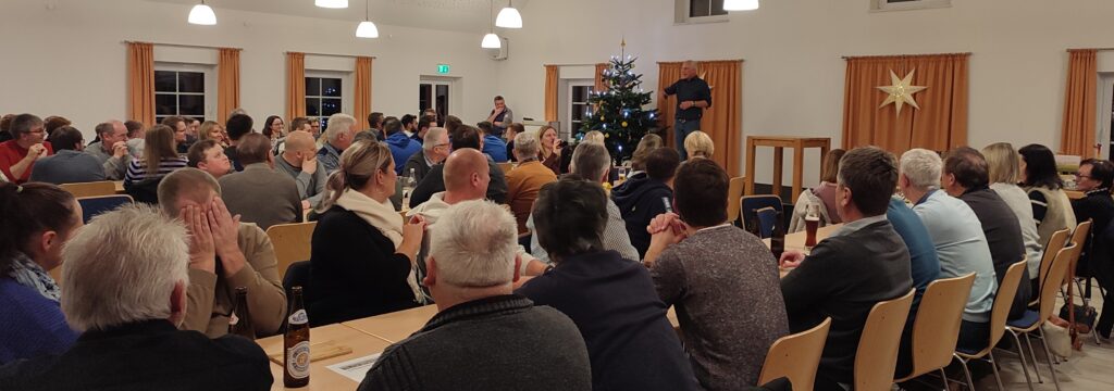 Heuer war der Ansturm auf die Christbaumversteigerung der Spielvereinigung Zangberg besonders groß. Zu Verdanken ist dies vielleicht dem Adventsmarkt, der dieses Jahr zum ersten Mal am Dorfweiher stattfand. Dies hatte gleich mehrere Vorteile: die Hütten der SpVgg wurden mit Hilfe der anderen Ortsvereine früher aufgebaut und konnten gleich genutzt werden, außerdem war der Weg zur Versteigerung denkbar kurz und nach einem Glühwein zur Stärkung saßen auch die Scheine lockerer. Unser Auktionator Simon Matzinger führte schon bei seiner 2. Versteigerung souverän durch den Abend und wußte mit Geschick den Preis durch kleine oder auch mal größere Schritte in die Höhe zu treiben. Brot, Schinken, Wurstplatten, Bier und Wein fanden schnell willige Abnehmer und mit ein paar Wünschen aus dem Publikum gelang auch Armin Märkl als neuer Vorstand ein gelungener Einstand bei seiner ersten Christbaumversteigerung als „Anreicher“. Sein Durchhaltevermögen hat er in jedem Fall unter Beweis gestellt und harrte bis in den Morgen mit den letzten Zechern aus.