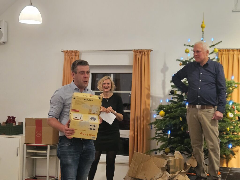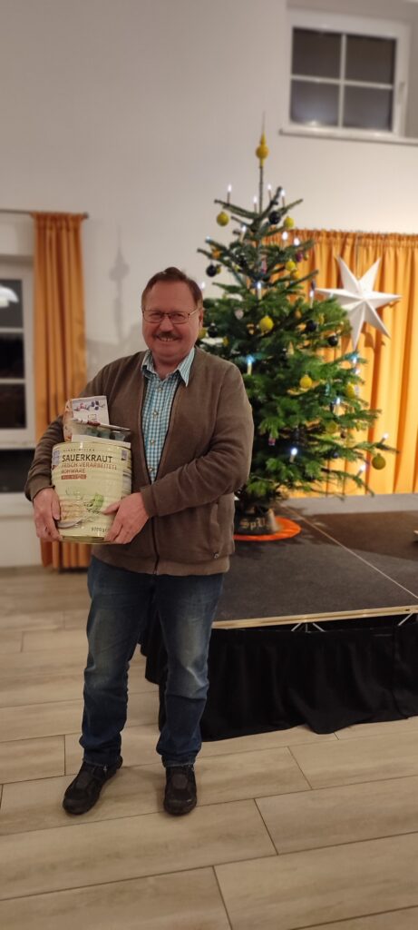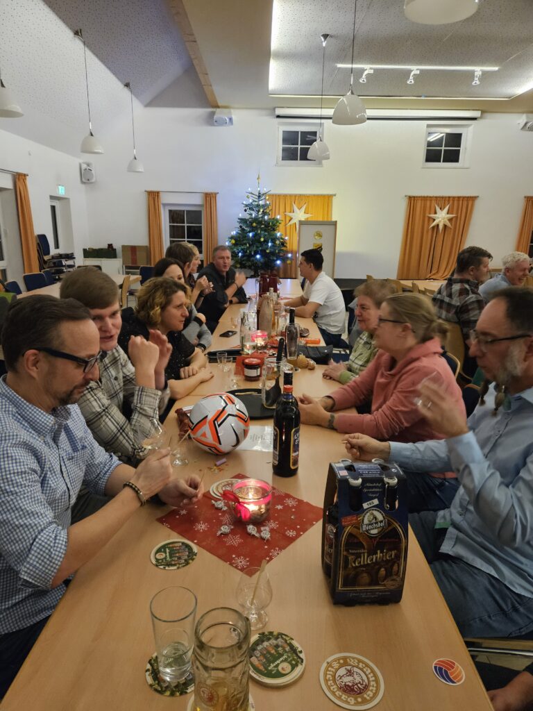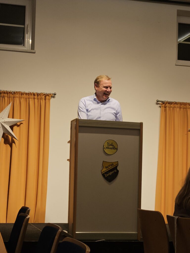 Der Bürgersaal war voll und ein lustiger Abend begann! Nach leckerem Rinder- und Schweinebraten wurden die Lachmuskeln bewegt. Mit einer „Weihnachtsgeschichte“ vom Bierdimpfe und einen Rückblick auf die Zangberger Nächte 2025 ließ Gerhard Reichl vor Staunen den Saal verstummen und vor Lachen erbeben. Das Spiel der Fussballer ließ die Teilnehmer schön aneinander vorbeireden und dann mit Schnaps anstoßen. Auch die Tombola sorgte für glückliche Gewinner und nach vielen Ehrungen trafen sich die Gefundenen an der gut besuchten Bar! Natürlich durfte auch der Besuch des Nikolauses an diesem Abend nicht fehlen – sein Auftritt war kurz und schwankend – Prost!